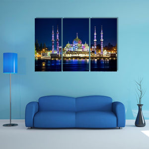 This canvas art beautifully captures the stunning architecture of the Crystal Mosque, illuminated under a serene night sky. With vibrant blues and gentle reflections on water, it offers a majestic ambiance, making it an excellent addition to any room.
