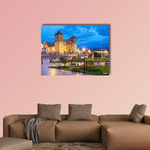 This canvas art captures the vibrant atmosphere of Cusco, Peru, showcasing a charming cityscape with a cathedral, bustling plaza, and lively streetlights. The peaceful evening vibe, enhanced by the warm palette of yellows, blues, and greens, brings a sense of tranquility to any space.