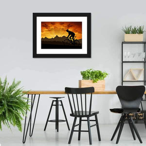 Silhouette Of Cyclist Canvas Wall Art shows a cyclist on a road against a mountain sunset. Warm orange and yellow tones contrast with a black silhouette to create a dramatic, energetic yet peaceful scene. Suitable for modern homes, living rooms, home offices, or sports-themed spaces.