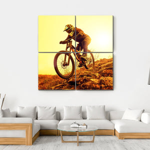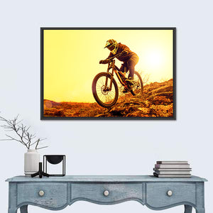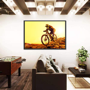 This canvas art captures the thrill of downhill biking through rugged terrain. A mountain biker, dressed in helmet and gear, speeds past as the setting sun casts vibrant hues of yellow and orange, creating a mood of action and adventure. Perfect for adding an energetic touch to your space.