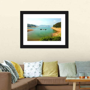 Daecheongho Lake Canvas Wall Art depicts a peaceful lakeside scene with two barges, rolling hills and a distant bridge. The naturalistic greens, blues, browns and whites and wide-angle composition create calm depth, making it well suited to modern home wall decor.