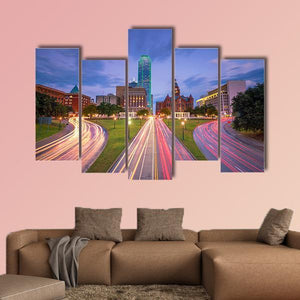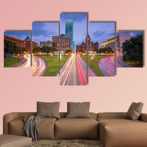 Dallas Downtown shows the city skyline and highway traced by long-exposure light trails, rendered in blue, pink and orange tones. The image reads as energetic and nocturnal, with leading lines and symmetry that emphasize urban motion. It suits modern or abstract interiors, such as a living room or office with urban decor.