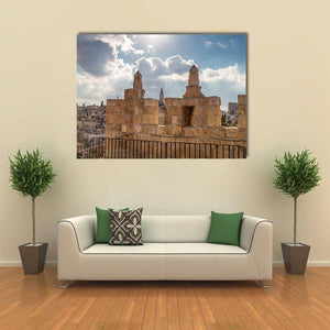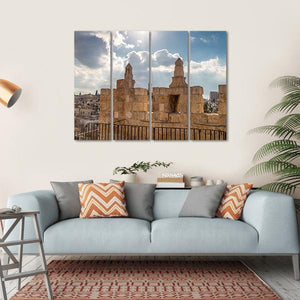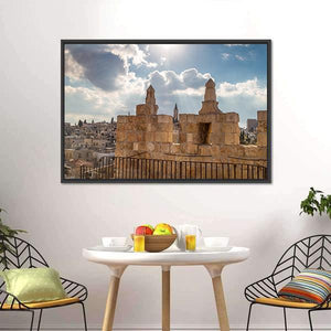 This artwork captures the historic beauty of the ancient Damascus Gate in Jerusalem, featuring a stunning city skyline alongside stone turrets and distant spires. The vibrant palette of tan, blue, and white adds a timeless quality to your wall decor.
