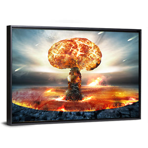 This striking canvas art features a dramatic mushroom cloud, capturing the intensity of a catastrophic explosion and its surrounding debris. The palette of orange and red contrasts with deep blacks and blues, evoking a powerful, destructive mood that's hard to ignore.