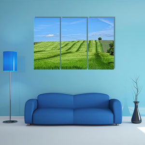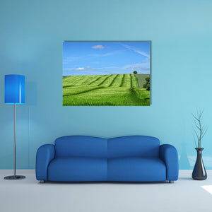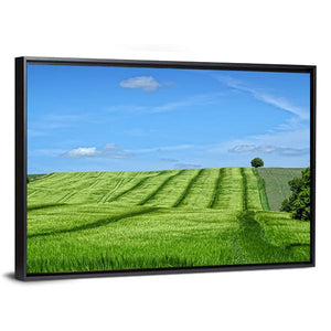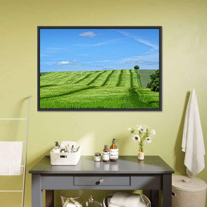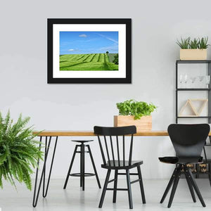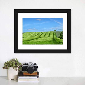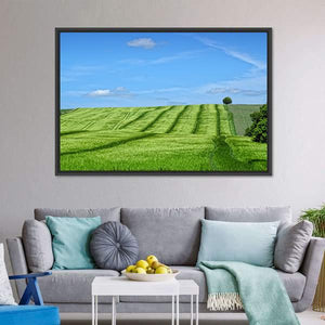 This landscape artwork captures a serene Danish countryside scene, featuring a grassy field, a tree, and a blue sky filled with clouds. The peaceful atmosphere makes it a great addition to any modern decor.