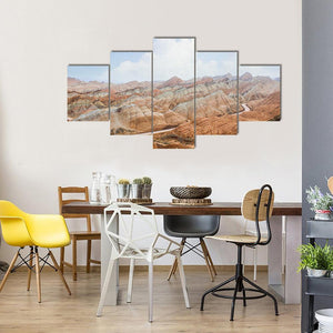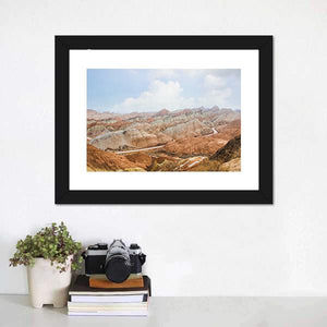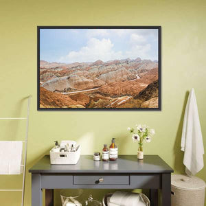 This captivating canvas art features the stunning Danxia Mountains in China, showcasing vibrant rainbow mountains and a winding road through a vast, serene landscape. Its warm palette of orange, tan, and white brings natural beauty to your space.
