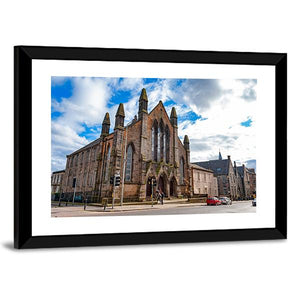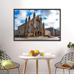 A realistic cityscape of a Gothic stone church seen at street level, rendered in brown, blue, white, and gray tones under a cloudy sky. Its grand, historic, imposing presence works well in living rooms, studies, or hallways that favor architectural or modern decor.