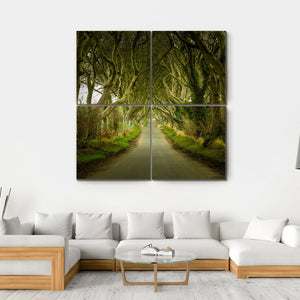 This canvas art captures a serene tree-lined road enveloped by overhanging branches, creating an inviting archway. The palette of green, brown, and gray evokes a mysterious mood, perfect for adding a touch of nature to your space.
