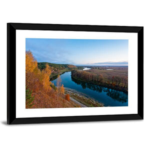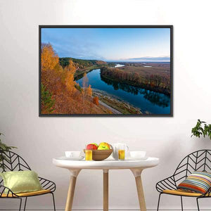 Dawn Over River Canvas places a winding river and autumn trees front and center, with reflections in the water and wispy clouds above to set a peaceful, serene scene. The blue, orange and green palette creates an autumnal atmosphere that suits modern, nature-inspired room decor.