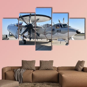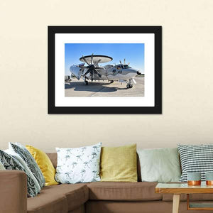 E-2 Hawkeye Canvas Wall Art shows a low-angle, centered view of the E-2 Hawkeye with its radar dome and visible propeller blades, including aircraft number 459. The realistic print uses a gray, white and blue palette to convey a powerful, technical, observational mood. It fits well in modern homes or aviation-themed rooms as focused wall decor.