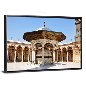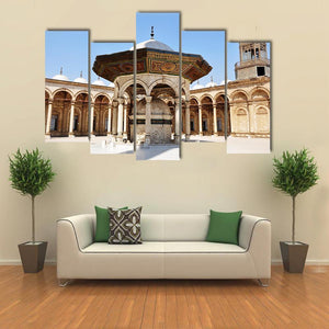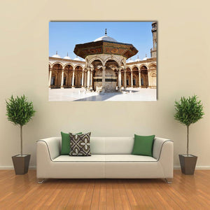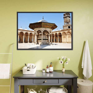 This canvas art captures the serene beauty of the Omayyad Mosque, featuring a majestic courtyard, fountains, and architectural arches under a clear blue sky. The harmonious palette of blue, tan, and gold brings a historic charm to any space.