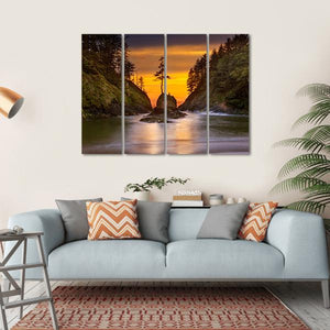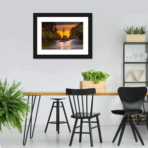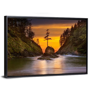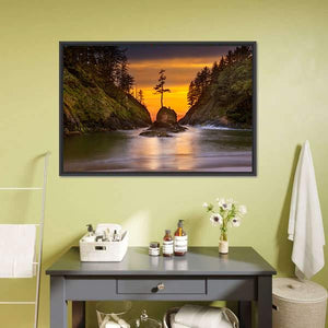 Experience the tranquil beauty of Deadman's Cove with this canvas wall art that features a serene sunset over cliffs and a single tree on a rock. The soothing palette of orange, yellow, green, brown, and blue creates a golden atmosphere, making it a perfect addition to your home decor.
