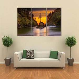 Deadman's Cove shows a lone tree on a rocky coastline as the sun sets over the sea, using warm oranges and cool blues. The realistic landscape feels serene and dramatic, and suits modern or nature-themed rooms in the home.