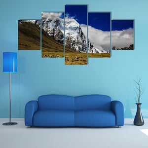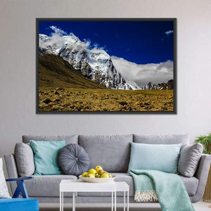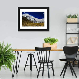 Snowy Himalayan peaks rise against a wide blue sky, creating a majestic, awe-inspiring scene. The photorealistic, dramatic composition highlights jagged peaks and sparse vegetation, a natural focal point for modern rooms and nature-focused wall decor.