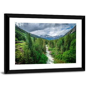 This panoramic canvas captures a mountain range rising above a deep forested valley with a winding stream and a small wooden structure at the left beneath a cloudy sky and snow-capped peaks. Rendered in realistic nature-photography tones of green, blue, gray, and white, the scene feels serene, vast, and majestic and suits modern or nature-inspired rooms.