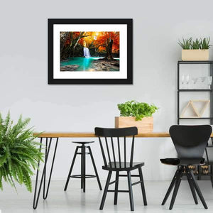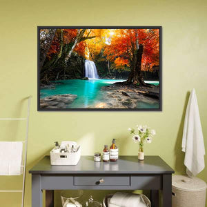 This canvas shows a photorealistic waterfall in a green forest, with sunlight filtering through trees and clear turquoise water among rocks. The composition uses depth and rule-of-thirds to create a serene, vibrant, refreshing mood. It works well in modern or nature-inspired rooms as calming wall decor.