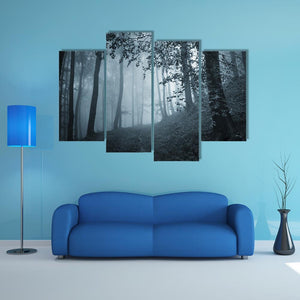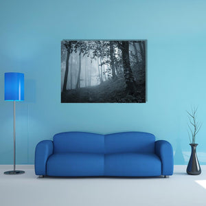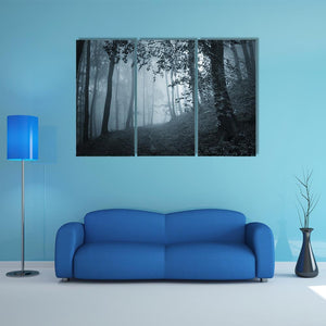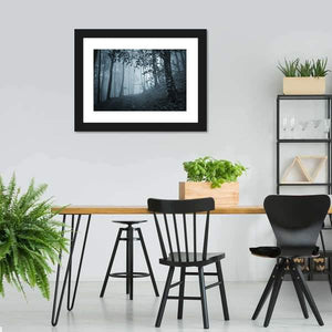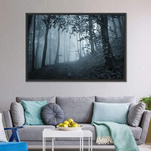 This landscape artwork features a serene forest path shrouded in fog, with trees framing the scene. Its moody palette of blue, gray, and black creates a mysterious atmosphere, perfect for adding a touch of tranquility to your space.