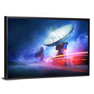 This abstract canvas art features two satellite dishes under a starry night sky, with dynamic light streaks in red and yellow. Its futuristic vibe captures the wonder of the cosmos, making it a captivating addition to any space-themed décor.