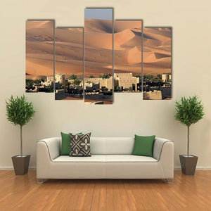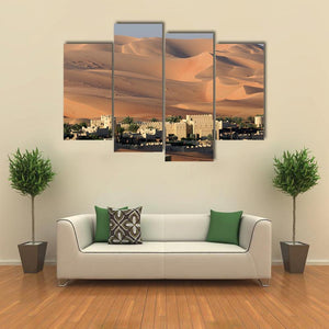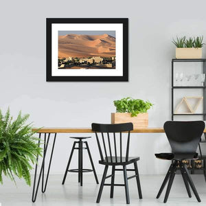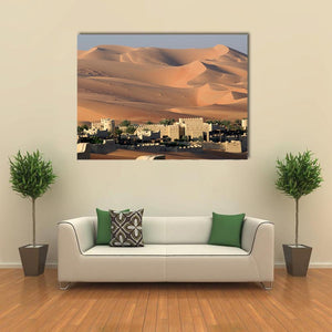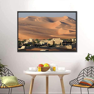 Abu Dhabi Desert Canvas Wall Art shows a serene desert town with white crenellated buildings, rolling sand dunes, and green palm trees beneath a pale blue sky. Rendered in a realistic mid-range wide view with warm tan, beige, and white tones, it gives a peaceful, dry atmosphere. It fits well in modern living rooms or entryways with neutral, nature-inspired decor.