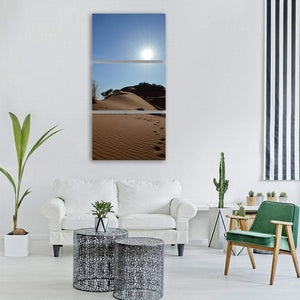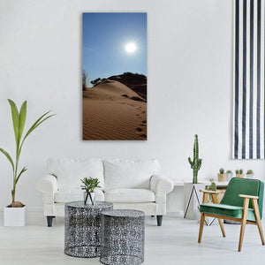 Depicts a sunlit African desert with rippled sand dunes, scattered bushes, a trail of footprints and a subtle sun flare in a photographic nature style. The warm brown and blue palette and peaceful mood make it a calm choice for modern room decor.