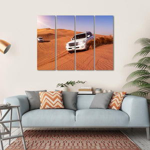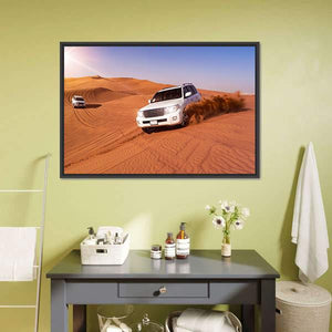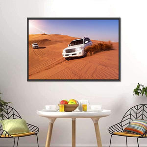 This dynamic canvas captures the thrill of off-road vehicles racing across vast desert dunes. With a vibrant palette of orange, white, blue, and yellow, it conveys an adventurous, energetic atmosphere that resonates with lovers of automotive art.