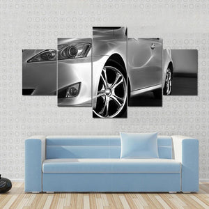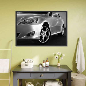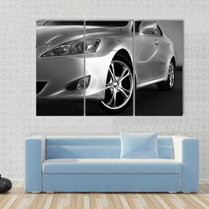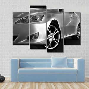This canvas features a detailed close-up of a sleek sports car, highlighting its chrome wheel and sharp headlight design. With a modern and luxurious vibe, it complements contemporary décor beautifully.