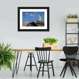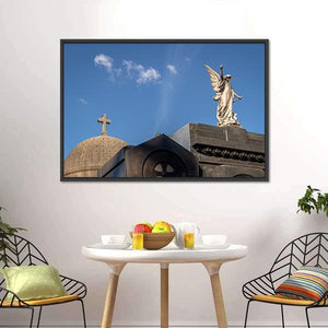 This photorealistic canvas depicts an angel statue, tomb, and cross at Recoleta Cemetery in Buenos Aires. Seen from a low, eye-level perspective in blues, whites, greys and tans, the scene feels somber, solemn and peaceful. It suits calm, modern interiors such as a study or hallway.