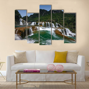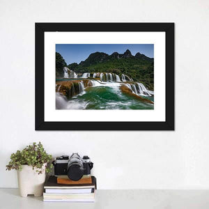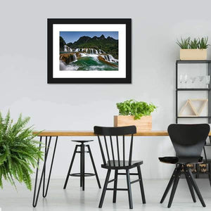 Detian Waterfall Canvas Wall Art shows a layered landscape of cascading water, forested mountains, and lush vegetation. The long-exposure photograph gives the falls a soft, flowing motion and a serene, majestic mood in greens, blues and whites. It suits modern home room decor, such as living rooms or bedrooms.