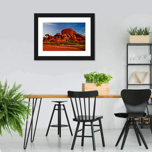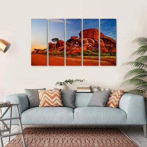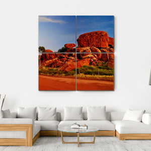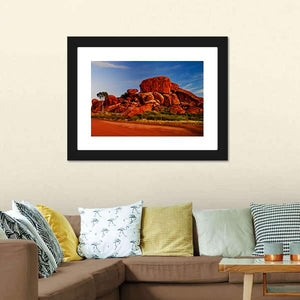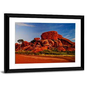 This captivating canvas art features the striking rock formations of Australia's Devil Marbles, surrounded by vibrant trees and an expansive outback landscape. The dramatic palette of red, orange, and blue captures the natural beauty and serene mood of the scene.