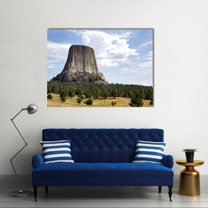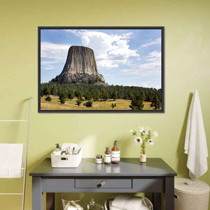 Capture the majestic beauty of Devils Tower with this canvas wall art. Featuring the striking rock formation surrounded by lush pine forests and serene meadows under fluffy white clouds, it brings a peaceful atmosphere to any space.