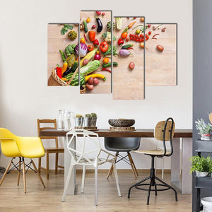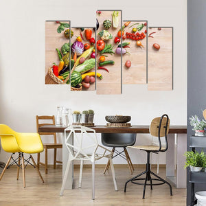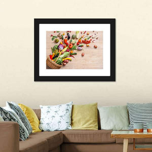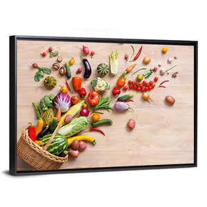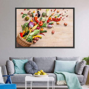 This vibrant canvas art features an overhead shot of a woven basket overflowing with an assortment of fresh vegetables and fruits, creating a lively atmosphere. Its realistic depiction adds a touch of nature to your decor.