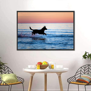A minimalist panoramic print of a dog running through water, shown as a bold silhouette in blue, white, black, and pink tones. The image feels energetic and joyful, with lively motion that fits modern, minimalist rooms and contemporary living spaces.