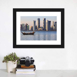 This canvas features a serene representation of Doha's skyline, showcasing modern skyscrapers reflected in calm waterfront waters. A traditional dhow boat adds a touch of culture, while a palette of blue, white, and tan creates a bright and tranquil atmosphere.
