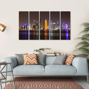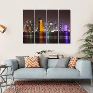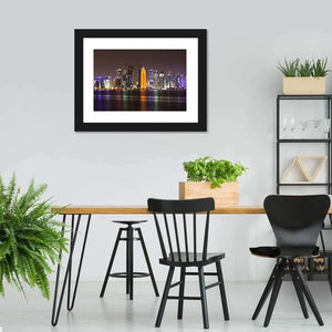 Experience the vibrant Doha skyline as it comes alive at night. This artwork showcases illuminated skyscrapers and a stunning waterfront, reflecting a modern cityscape. It's a captivating piece that adds a touch of nocturnal beauty to any room.