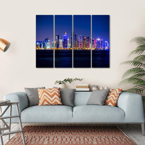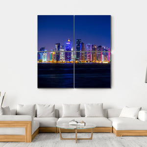 Experience the vibrant energy of Doha with this captivating canvas art featuring illuminated skyscrapers against a stunning city skyline. The rich palette of blues, purples, and golds creates a modern atmosphere, making it a perfect addition to contemporary décor.