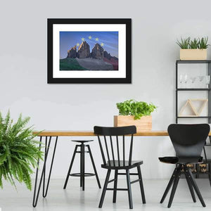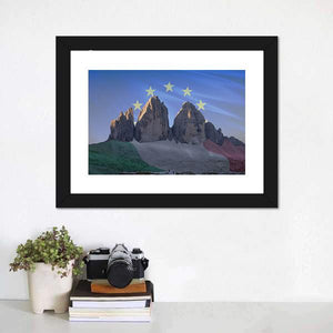 The Dolomiti Flags Series depicts mountain peaks painted in Italian flag colors with stars set against a blue sky, rendered in a realistic style and composed by the rule of thirds. The scene feels patriotic, majestic, and serene, and it works well in modern home decor or living spaces that want a nature-focused focal piece.