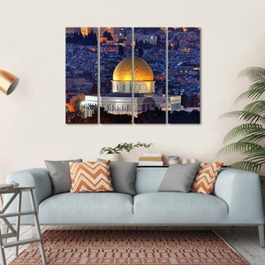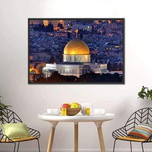 This canvas art features the iconic Dome of the Rock against the serene skyline of Jerusalem. Captured in a nighttime setting, the glowing golden dome and city lights create a peaceful and historic atmosphere, perfect for adorning your living space.