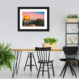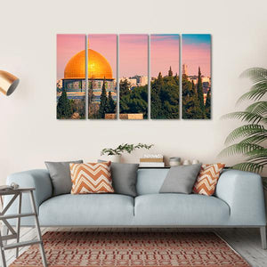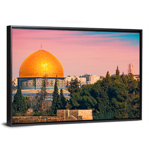 This canvas features the iconic Dome of the Rock amid a scenic Jerusalem cityscape. With a peaceful blend of gold, blue, and green hues, it evokes a historical harmony that can enhance any room's decor.
