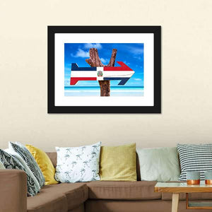 This canvas art features a wooden arrow sign with the Dominican Republic flag, beautifully set against a vibrant beach and ocean backdrop. Its tropical colors evoke a sense of vacation and relaxation, perfect for brightening up your living space.