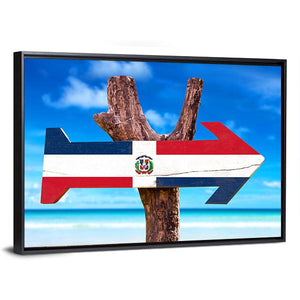 This vibrant canvas artwork features the Dominican Republic flag, beautifully designed with a tropical atmosphere. The striking colors of red, white, and blue along with a directional arrow create an inviting vibe that enhances any space.