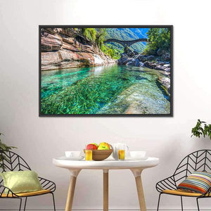 This canvas art features a serene landscape of the Verzasca River, showcasing an ancient stone bridge framed by majestic mountains and lush trees. Its calming palette of greens, blues, and browns invites tranquility into your space.