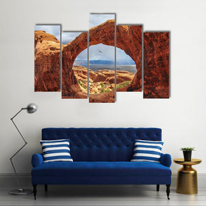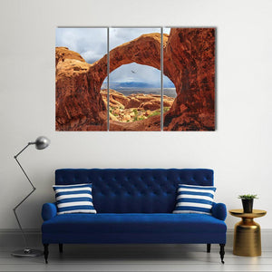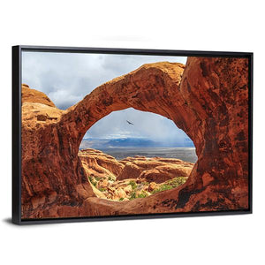 Double O Arch, Utah centers a red sandstone natural arch beneath a stormy desert sky. The realistic landscape shows a bird in flight and distant mountains with rain visible, creating a dramatic, awe-inspiring mood that fits modern living rooms and entryways.