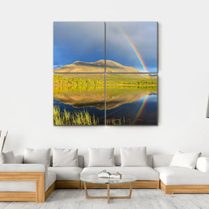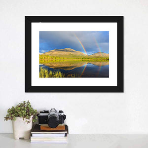 This canvas art features a breathtaking double rainbow arching over serene mountains and a tranquil lake. The vibrant colors of green, blue, and purple create a majestic atmosphere, making it a stunning addition to your décor.