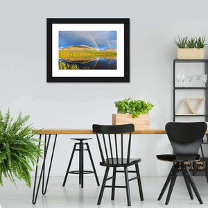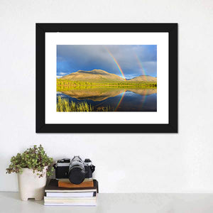 This canvas art captures a serene moment above a mountain lake, where a majestic double rainbow arcs gracefully. The vibrant greens and blues are complemented by soft yellow and gray tones, creating a naturalistic scene that enhances any space.