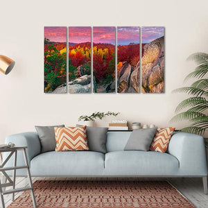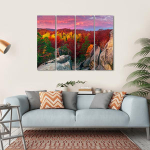 This vibrant canvas artwork captures the majestic beauty of a Ukrainian landscape with rich autumn foliage, dramatic skies, and a peaceful forest scene. Its realistic style and warm palette of reds, yellows, and greens bring life to any wall.