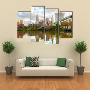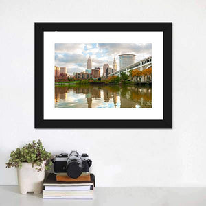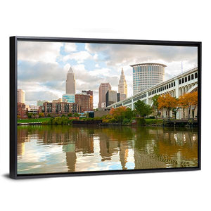 This horizontal canvas wall art captures the serene skyline of Downtown Cleveland, featuring a beautiful reflection in the river. The peaceful blend of blues, greens, and browns creates an inviting urban atmosphere.