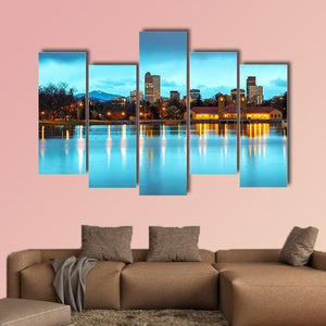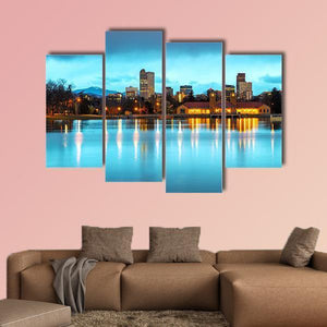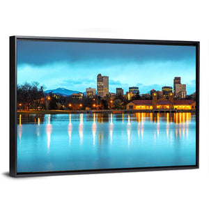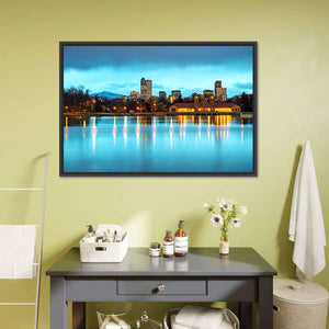 Downtown Denver, Colorado depicted as a calm cityscape with illuminated buildings at dusk and reflections in the water against distant mountains. Blues, teals, grays and touches of yellow give the scene a serene, reflective mood. The modern look suits contemporary living rooms or offices as subtle wall decor.