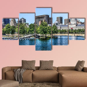 Montreal Behind Lake presents a peaceful, bright waterfront cityscape—buildings, treeline and a dome-shaped building sit above calm water under an open sky. Rendered in realistic, vibrant blues, greens, white and brown, the print pairs urban structure with natural calm. It suits modern spaces and room decor that favor nature-forward city scenes.