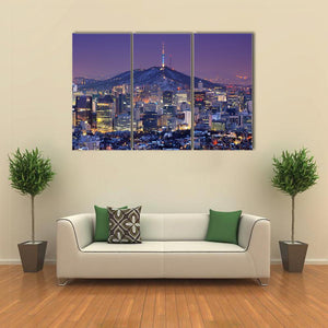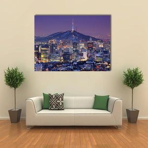 This canvas art showcases the vibrant skyline of Seoul, highlighting illuminated buildings and a majestic television tower against a dramatic sky. Its rich palette of purple, blue, and orange adds an urban flair that complements modern décor.