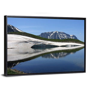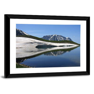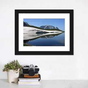 Dragon Lake & Astraka Peak captures a wide-angle landscape of a snowy mountain, green hills and a calm lake with a clear reflection. Rendered in cool blues, whites and greens, the scene feels serene and vast and works well in modern or nature-inspired rooms like living rooms, bedrooms or offices.